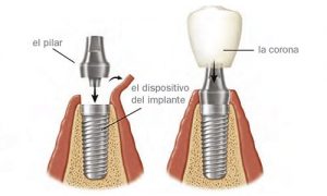 Fig. 1. Primera etapa (oseointegración) se coloca el tornillo en el hueso y se deja tapado. En la segunda etapa (rehabilitación) se abre, se retira el tapón de la superficie del tornillo y se coloca el pilar y la corona.